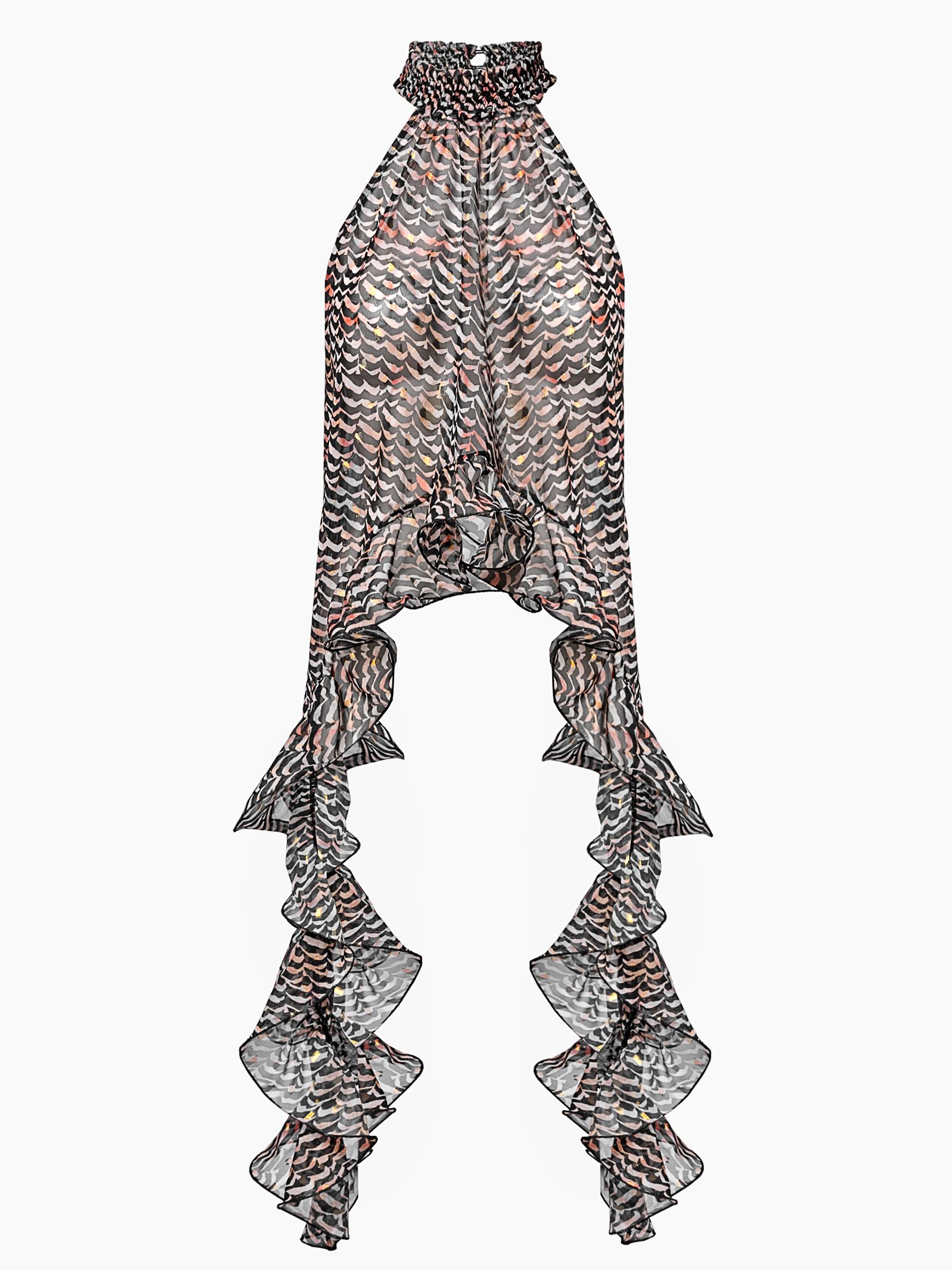 Το PROJECT SOMA Carmina Top κατασκευάζεται από αέρινη silk touch μουσελίνα με χρυσές λεπτομέρειες. Top με ασυμμετρίες στα πλαινά και βολάν.