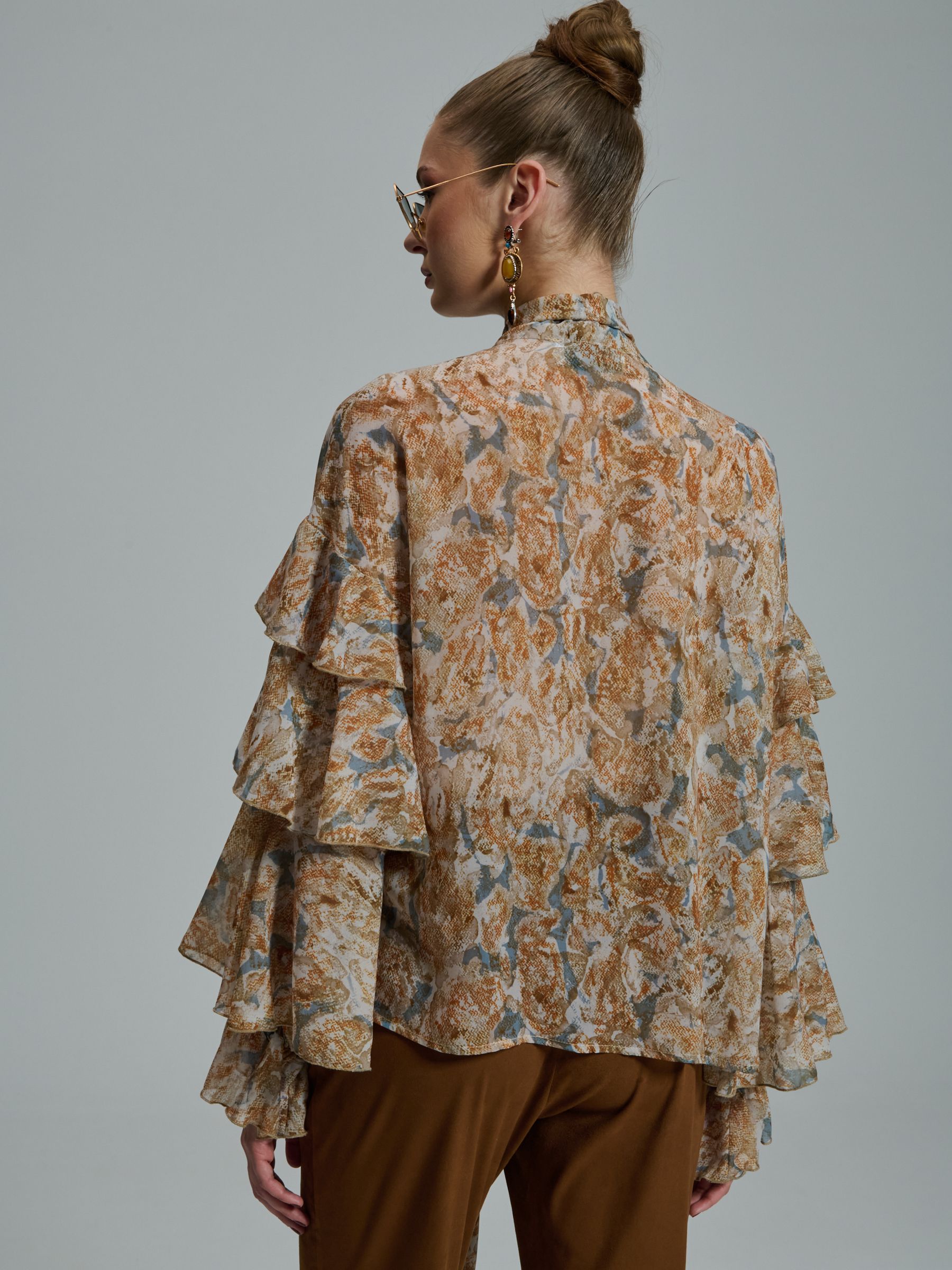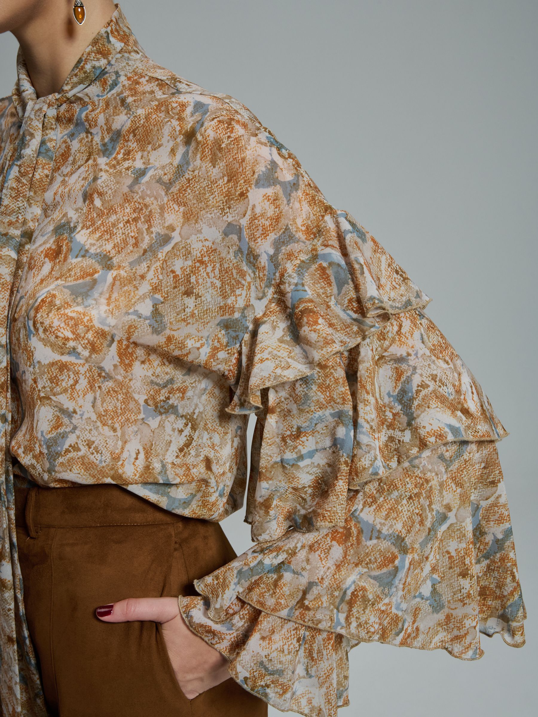 Το PROJECT SOMA Laura Beige Top κατασκευάζεται από αέρινη silk touch μουσελίνα. Top με μαντήλι στο λαιμό και βολάν στα μανίκια.