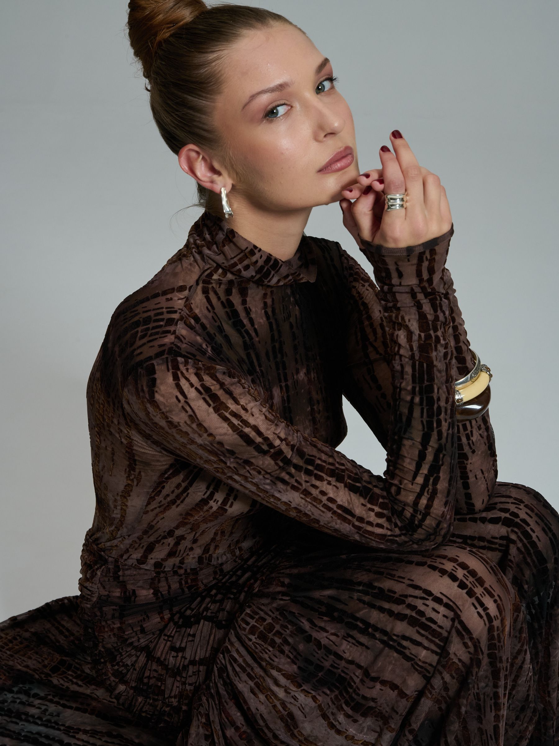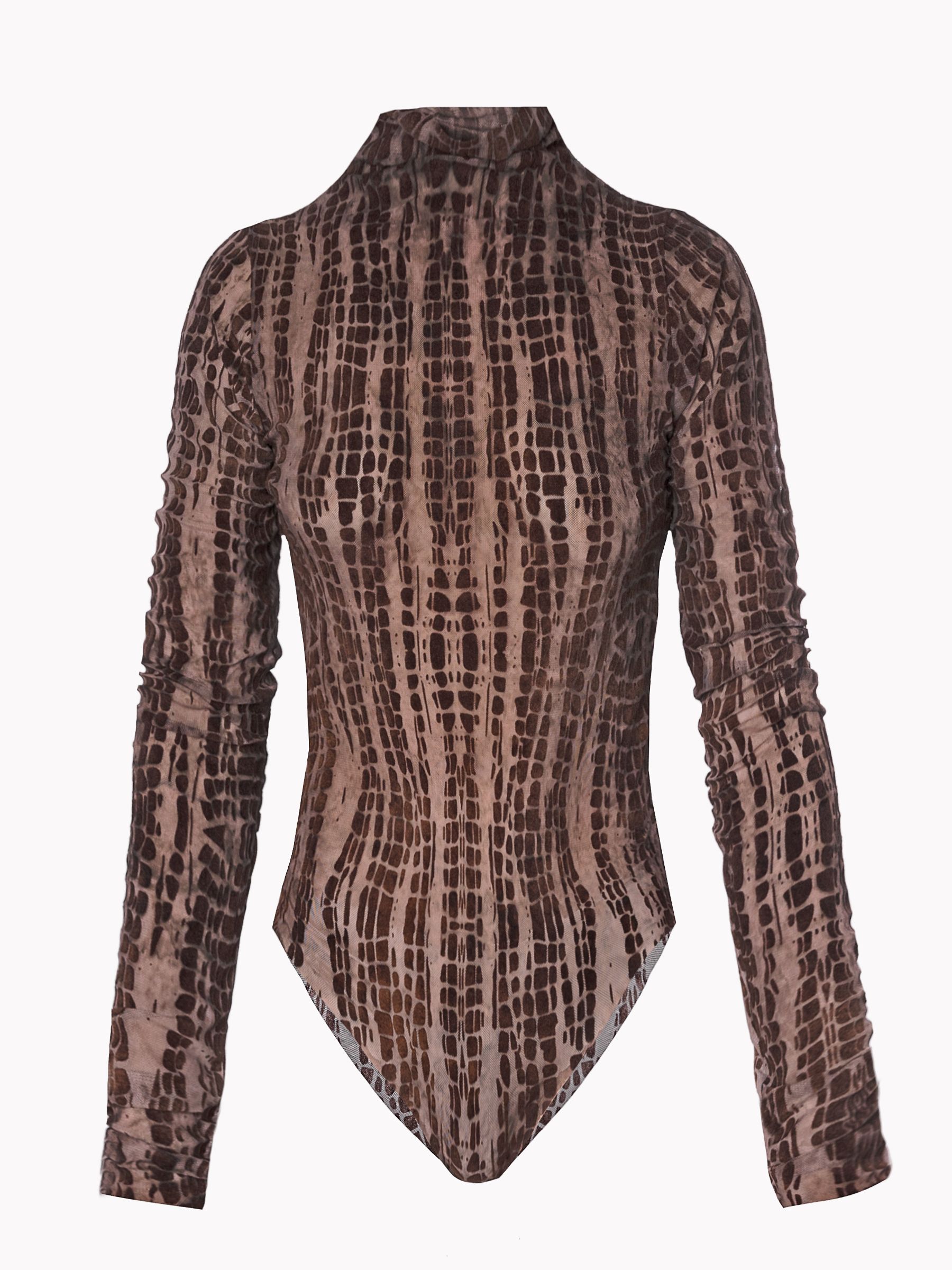 Το PROJECT SOMA Loredana Brown Bodysuit κατασκευάζεται από ιδιαίτερο, ελαστικό, τούλινο ύφασμα με 3D βελούδινο σχέδιο. Bodysuit με όρθιο γιακά.
