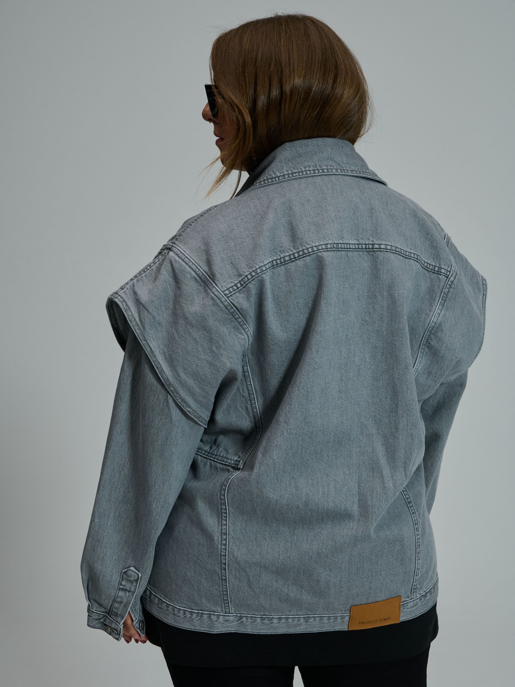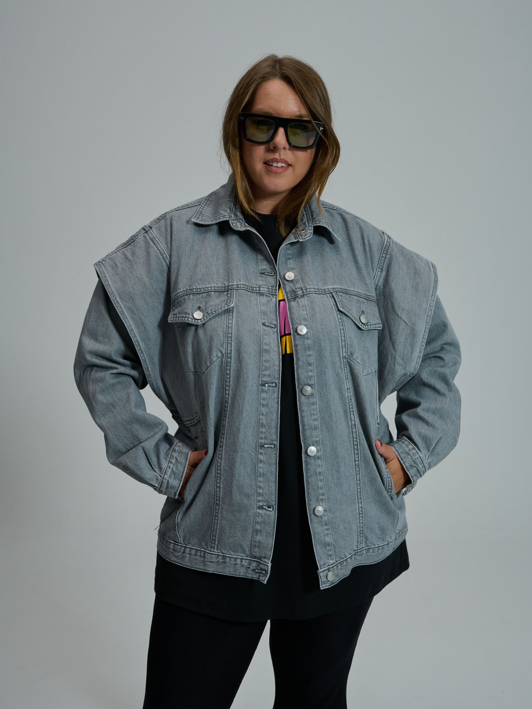 Το PROJECT SOMA Ridley Grey Jacket κατασκευάζεται από οργανικό βαμβακερό ύφασμα.Oversized denim jacket με λεπτομέρειες στους ώμους.