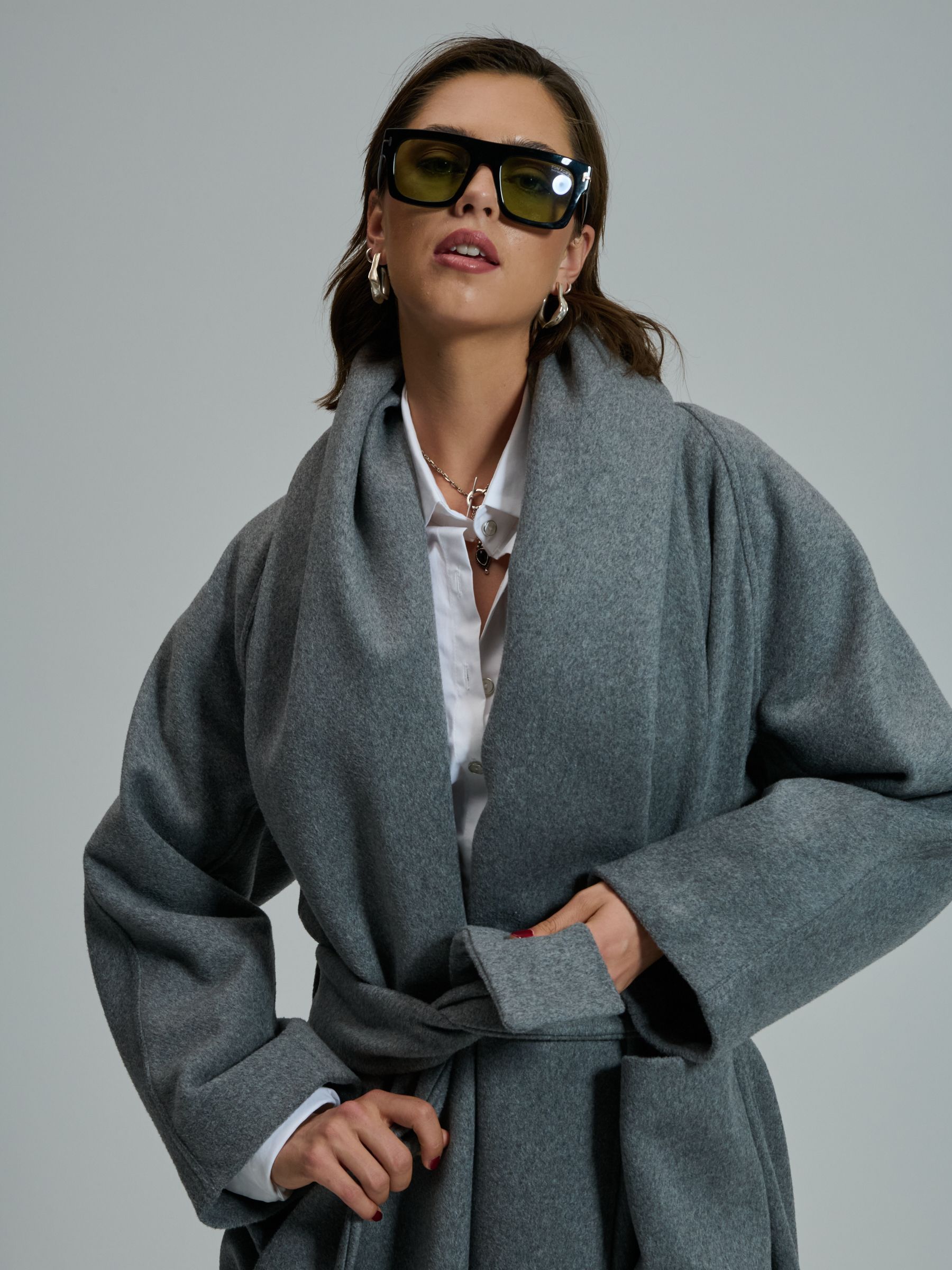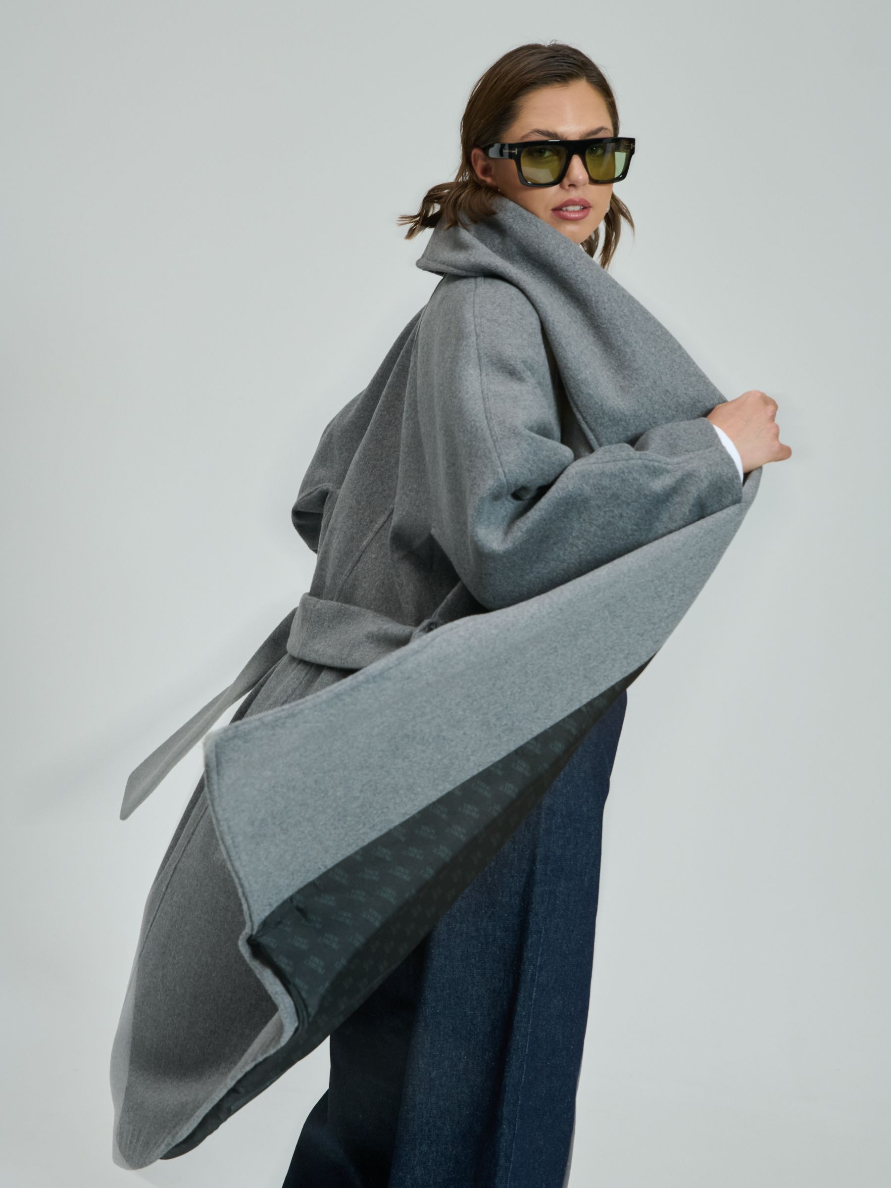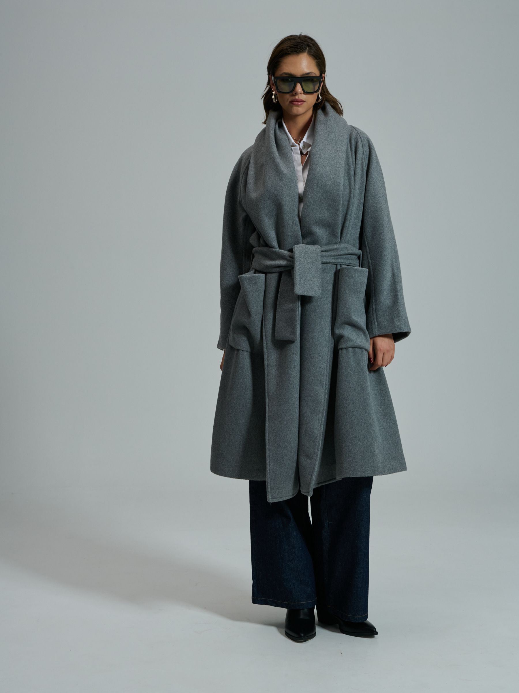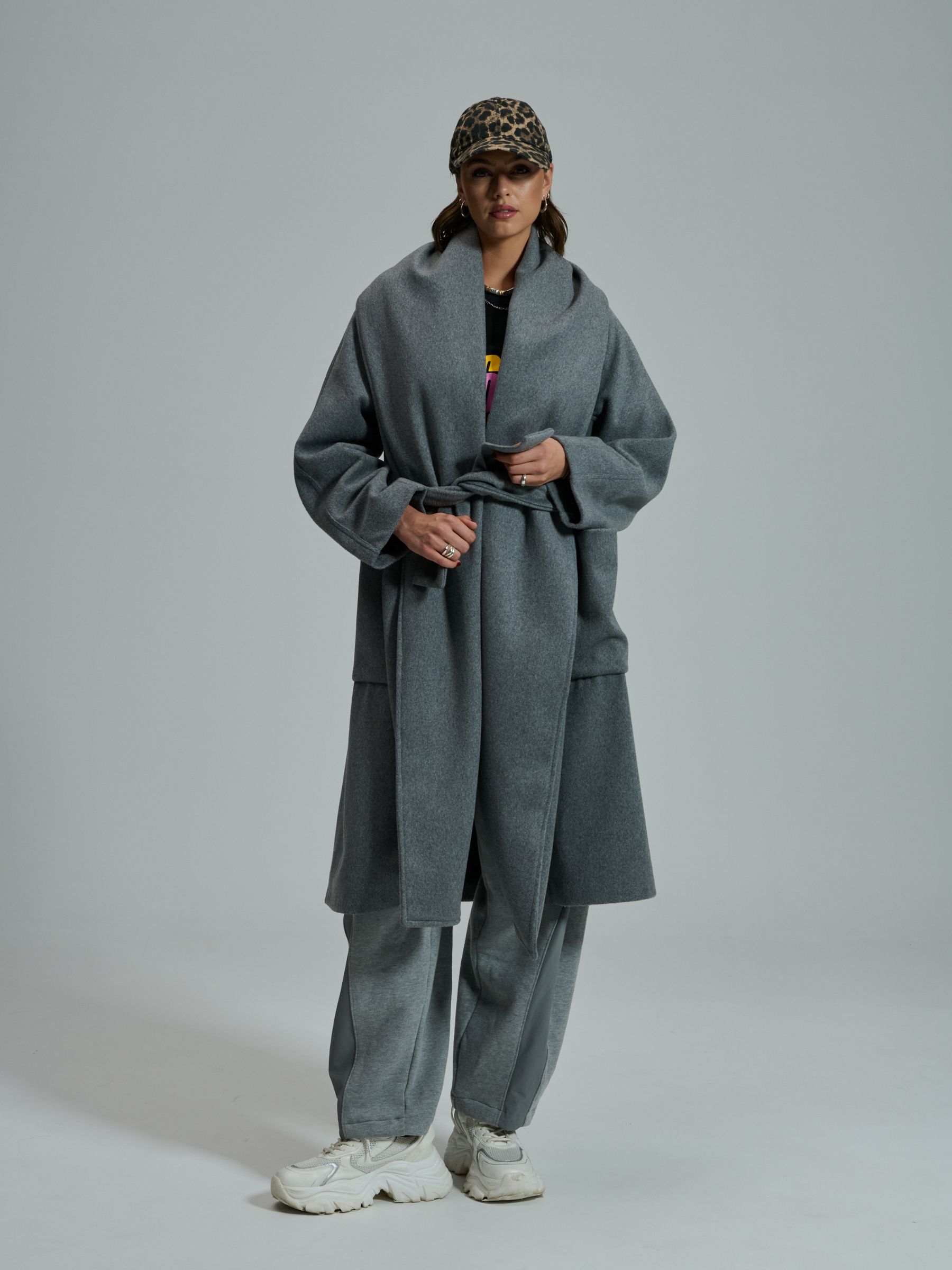 Το PROJECT SOMA Teressa Grey Coat κατασκευάζεται από premium ύφασμα. Oversized maxi παλτό με μονοκόμματο γιακά και ζώνη.